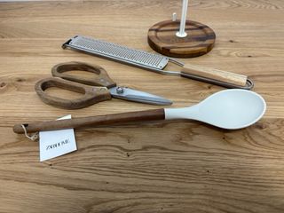 • ENVÍO A PARTIR DEL 23 DE MARZO. • NO VENDO SEPARADO. • NO BAJO EL PRECIO. • SOLO HAGO ENVIOS. Portarrollo para papel de cocina de hierro con base de madera. Medidas: Altura: 35 cm Anchura: 14 cm Fondo: 14 cm Peso: 516 g Tijeras de acero inoxidable con mango de madera. Medidas: Alto: 1,6 cm Ancho: 23,13 cm Fondo: 10 cm Peso: 148 g Rallador alargado de acero con mango de madera de acacia. Medidas: Alto: 19 cm Ancho: 8 cm Fondo: 1,3 cm Peso: 122 g Cuchara de cocina de silicona blanca y madera de acacia. Zara Home. Medidas: Alto: 33,25 cm Ancho: 3,31 cm Fondo: 7,01 cm Peso: 66 g