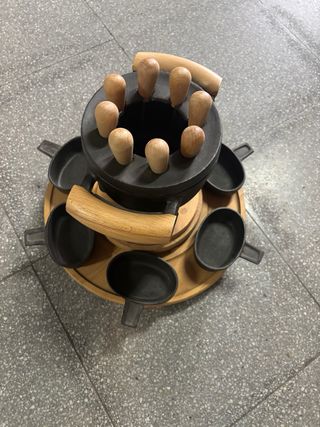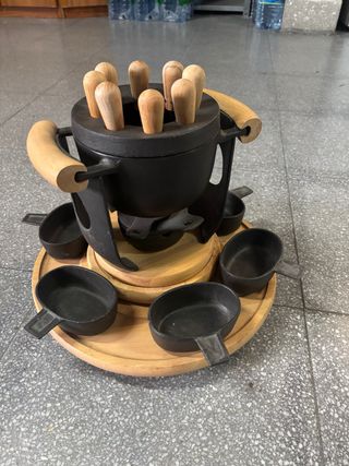 Set de fondue de hierro fundido con base de madera y accesorios. Nunca utilizado - Olla principal de hierro fundido. - Base de madera. - Incluye 6 tenedores de madera. - 6 recipientes individuales de hierro fundido.