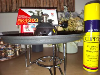 Plato de hierro fundido con hornillo integrado, ideal para servir carnes a la piedra o a la brasa. El hornillo permite mantener la comida caliente en la mesa. - Plato de hierro fundido. - Hornillo con regulador de gas. - Base metálica.