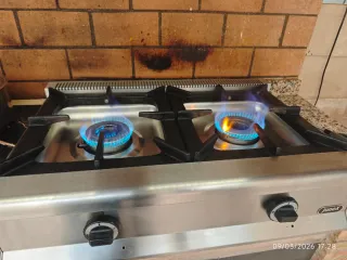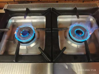 Vendo cocina de gas profesional de sobremesa (2 fuegos). Ideal para hostelería o cocinas de exterior. ✅ Fabricada en acero inoxidable. ✅ Rejillas de fundición en hierro (muy robustas). ✅ Alta potencia: 18 Kw totales (9+9 Kw). ✅ Válvula de seguridad con termopar y llama piloto. ✅ Configurada para Butano/Propano (se puede adaptar a Gas Natural). 📏 Medidas: 80cm ancho x 49cm fondo x 20cm alto. ⚖️ Peso: 20kg. En perfecto estado de funcionamiento. Venta por cierre de local. Preferiblemente en mano.