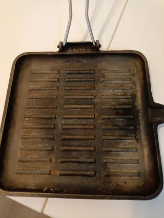 Parrillas de hierro fundido de la marca Bergner, con unas dimensiones de 33x19 cm 26x26 cm El mango es plegable para facilitar su almacenamiento. - Mango plegable para ahorrar espacio. - Distribución uniforme del calor. Nuevas sin uso Las dos por 50€ La mas pequeña 27€ y la mas grande 30€