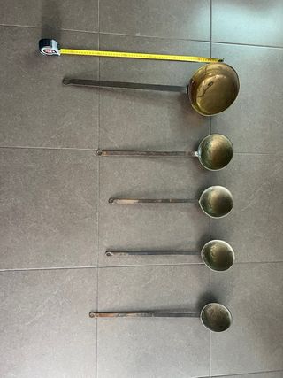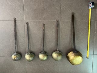 juego de 5 cazos de latón y asas de hierro, son piezas antiguas y muy decorativas para casonas, bodegas, cocinas etc