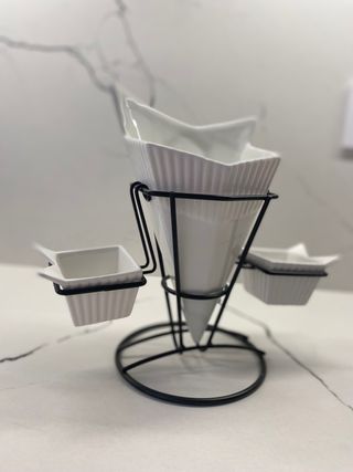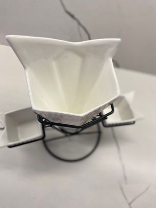 Cuenco de cerámica blanco con soporte de hierro negro y dos cuencos pequeños para salsas. Estan NUEVOS sin estrenar en su caja.