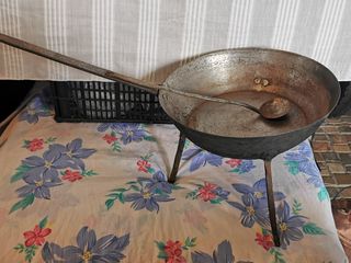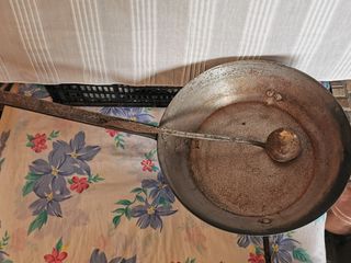 Es una saltende puchero antigua o tapadera popular, probablemente hecha de hierro forjado. Por lo general, estos artículos de cocina se fabricaban con hierro, bronce, latón o cobre. Detalles del objeto Material: Es probable que sea de hierro forjado debido a su aspecto rústico y envejecido, o posiblemente de cobre o latón. Uso: Se utilizaba tradicionalmente como tapadera para ollas de barro o pucheros. Características: Presenta una forma circular y un asa remachada en el centro para facilitar su manejo. ¿Te gustaría conocer más sobre la historia de los utensilios de cocina antiguos?