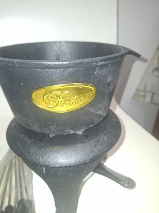 Juego de fondue de hierro fundido en color negro y dorado. Está en buenas condiciones, aunque presenta señales normales de uso. - Incluye una cazuela y un soporte. - Se incluyen también varias brochetas.