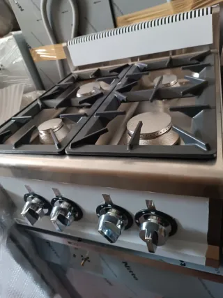 Cocina industrial de acero inoxidable con cuatro quemadores. - Encimera de acero inoxidable. - Parrillas de hierro fundido. - Mandos frontales. medidas: largo:0:60cm y fondo:0:65cm y altura:0:35cm