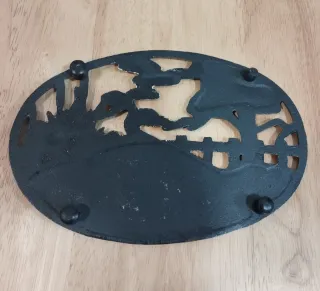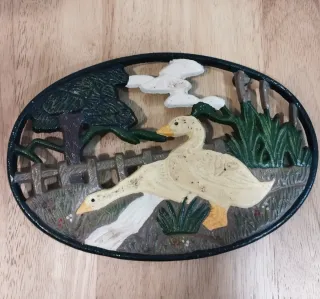 Este salvamanteles de hierro fundido presenta un encantador diseño de estilo cottage con patos y un paisaje campestre. - Material: Hierro fundido. - Diseño: Estilo cottage con patos y elementos naturales. - Acabado: Pintado a mano con detalles en verde, blanco y amarillo. La pintura tiene marcas del uso y del tiempo. Vintage, rústico