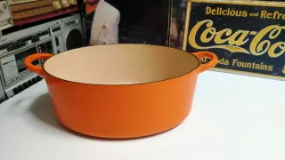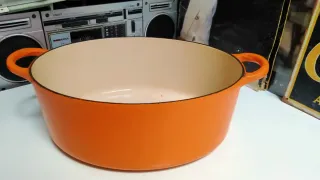 Olla tipo cocotte de la marca Le Creuset en un llamativo color naranja. Su forma ovalada la hace versátil para diversas preparaciones culinarias. Falta su tapa medidas: 32x25 cm Hierro fundido Diseño ovalado. Acabado esmaltado. venta en persona No hago envíos gracias.