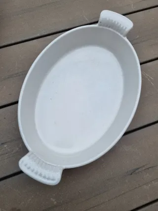 Plato ovalado de hierro fundido de la marca Staub. - Color naranja vibrante. - Diseño clásico con asas. - Ideal para servir.
