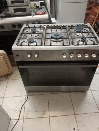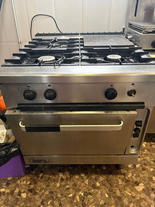 Cocina industrial de gas con horno. • 3 fuegos grandes • Plancha de hierro • Horno funcionando bien Ideal para bar, restaurante o food truck. Está usada pero funciona perfectamente. Se vende barata para venta rápida. Recogida en Valencia.