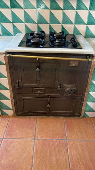 Esta cocina antigua de hierro es una pieza única con un diseño clásico. - Encimera de mármol. - Vitrocerámica de cuatro fuegos. - Puertas frontales de hierro con detalles. - Acabado en color marrón y dorado.