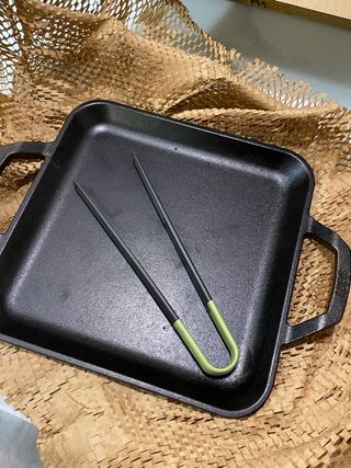 Sartén parrilla Lodge de hierro fundido, ideal para asar tus alimentos favoritos. Incluye pinzas con mango de plástico. Apto para todo tipo de cocinas gas, inducción, barbacoa... Nuevo sin estrenar Precio original 70€ - Material: Hierro fundido y plástico. - Color: Negro y verde