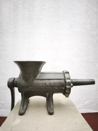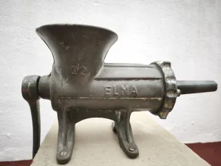 Picadora de carne manual de la marca Elma, modelo n° 22. • Está construida en hierro fundido. • Puede procesar entre 40 y 50 kg de carne por hora. • Sirve para picar carne y también puede funcionar como embutidora al añadirle los accesorios adecuados.