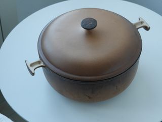 Imponente Cocotte Le Creuset de hierro fundido esmaltado diseñada por Enzo Mari de los años 70-80 probablemente, en color marrón degradado con un diámetro de 29 cm y una altura de 13 cm (es gigantesca). Como se puede observar en las imágenes ha tenido una vida intensa pero le quedan muchos años. La superficie de cocción está decolorada pero lisa y sin desconchones. La superficie exterior se beneficiaría de una limpieza profunda. El precio refleja su estado estético, ¡funcionalmente está en perfecto estado!