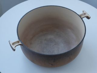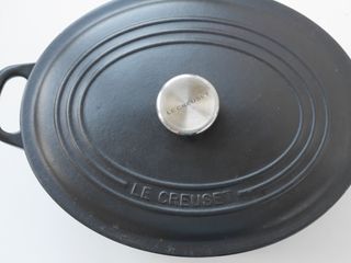Cocotte ovalada fabricada en hierro fundido esmaltado de de tamaño 29 x 23 cm y 12 cm de alto en color negro. La tapa es de la marca Le Creuset pero el cuerpo de la olla no indica ninguna marca y es probable que no lo sea. La superficie de cocción tiene una visible pátina característica de estas cocottes. La superficie exterior del cuerpo de la cocotte presenta algunas marcas importantes, también en la tapa, que se pueden ver en las fotos pero el estado funcional es bueno. El precio refleja su estado.