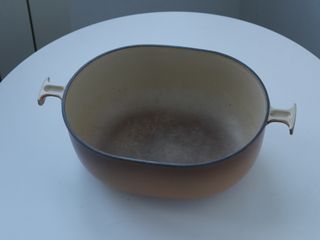 Cocotte ovalada Le Creuset de hierro fundido esmaltado diseñada por Enzo Mari de los años 70-80 probablemente, en color marrón degradado de 29 x 23 cm y 12 cm de alto. La superficie de cocción está decolorada pero lisa con un pequeño punto negro donde ha perdido el esmalte (ver fotos). La superficie exterior está en perfecto estado