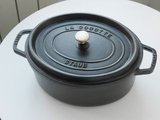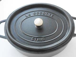 Preciosa cocotte ovalada fabricada en hierro fundido esmaltado de la marca francesa STAUB (tan buena y con tanta tradición como Le Creuset) de tamaño (30 x 25 cm y 12 cm de alto) en color negro Es una cocotte espectacular. La superficie de cocción está en perfecto estado con tan solo una leve pátina característica de estas cocottes desde su primer uso. La superficie exterior del cuerpo de la cocotte presenta algunas pequeñas marcas que se pueden ver en las fotos pero el estado es muy bueno.