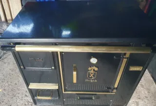 Cocina de carbón y leña de la marca Hergom, diseñada para calefacción y conexion a radiadores. Muy buen estado ya que apenas se ha usado. Presenta un acabado negro brillante y detalles ornamentales dorados. - Diseño decorativo clásico y robusto. - Puertas con cierres y tiradores dorados. - Placa decorativa con el nombre de la marca y modelo. - Venta por cambio de cocina.