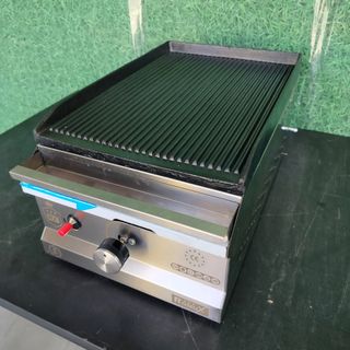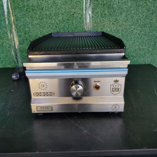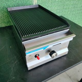 👨🍳 Maquinaria de Hostelería: Mobiliario y Productos para Profesionales y Particulares. Envíos a toda España 📞 684757283 ⛔ Precio + BAJO Grill profesional a Gas de sobremesa con placas Ranuradas de 47 cm de ancho. Carcasa de acero inoxidable. Temperatura de 50-300 ºC. Cajón de recogida de grasa. Placas de hierro fundido. Peso: 22 kg. Patas de goma. Interruptor de encendido. Potencia: 3,5 kw. Gas butano (modificable a gas natural). Medidas: 47x35x25 cm