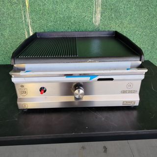 👨🍳 Maquinaria de Hostelería: Mobiliario y Productos para Profesionales y Particulares. Envíos a toda España 📞 684757283 ⛔ Precio + BAJO Grill profesional a Gas de sobremesa con placas Ranuradas de 57 cm de ancho. Carcasa de acero inoxidable. Temperatura de 50-300 ºC. Cajón de recogida de grasa. Placas de hierro fundido. Peso: 28 kg. Patas de goma. Interruptor de encendido. Potencia: 3,5 kw. Gas butano (modificable a gas natural). Medidas: 57x40x23 cm