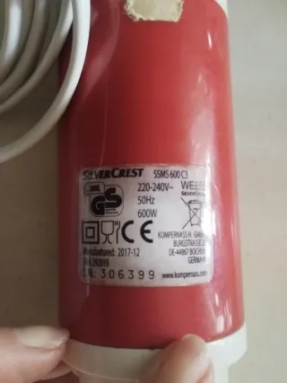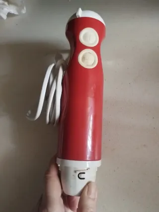 Batidora de mano con un diseño ergonómico y moderno. - Color rojo y blanco. - Dos botones de control. - Cable de alimentación enrollado. -Funciona a la perfección. -Solo es el motor, no tiene blazo ni accesorios.
