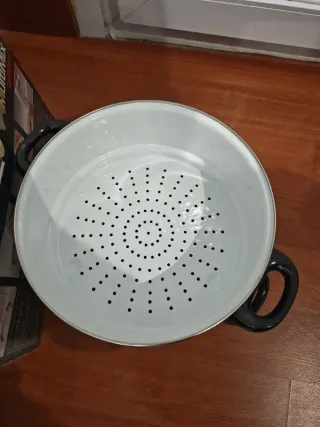 Vaporera de cocina de color blanco con asas negras. - Diseño de dos niveles. - Tapa con orificios y pomo negro.