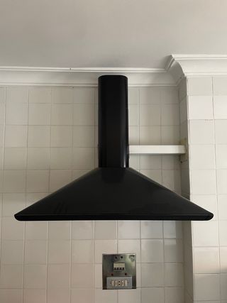 Campana extractora de cocina en color negro. Diseño moderno y elegante. - Acabado en negro mate. - Forma piramidal. - Incluye tubo de extracción.