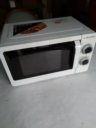 Microondas Jocel en color blanco, con una potencia de 700W. - Diseño compacto y funcional. - Dos mandos giratorios para ajustar tiempo y potencia. 20 litros 46, 5 x 25,6 x 35,4 cm