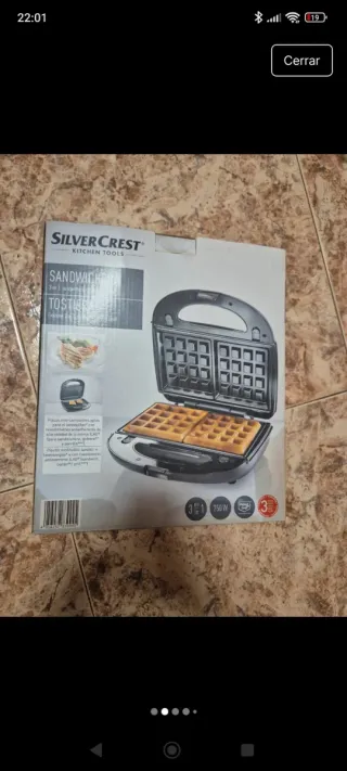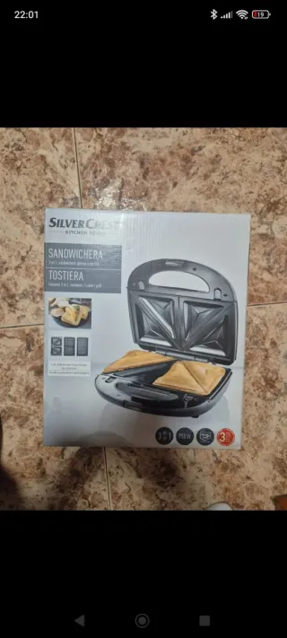 Sandwichera SilverCrest 3 en 1 para preparar sándwiches y gofres. Cuenta con placas intercambiables para diferentes usos. - Placas antiadherentes. - Indicador luminoso de encendido y listo. - Potencia de 750W.