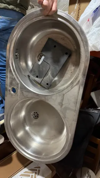 Fregadero de cocina sin usar, fabricado en acero inoxidable. - Dos senos. - Material: Acero inoxidable.