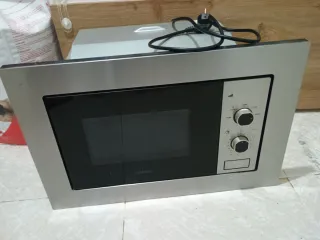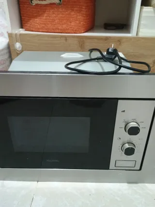 Microondas de la marca Valberg con acabado plateado y puerta de cristal negro. - Panel de control con dos diales. - Diseño moderno y compacto.NO CALIETNTA ! Algun manitas ! . O para piezas