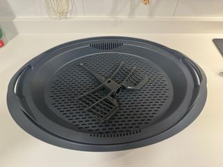 Rejilla de repuesto para freidora de aire. Fabricada en metal negro, con un diseño circular y perforado para una óptima circulación del aire. - Material: Metal. - Color: Negro. - Diseño: Circular con ranuras.
