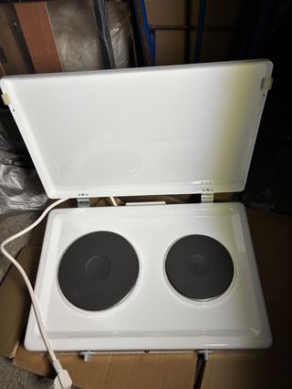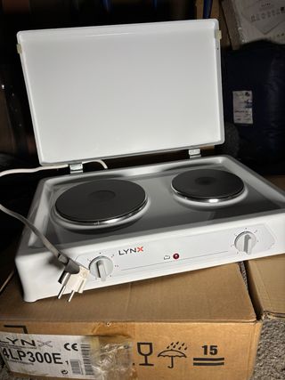 Cocina eléctrica portátil LYNX modelo ALP300E, totalmente nueva y sin uso. Tiene dos placas eléctricas con regulación independiente de temperatura y tapa protectora. Funciona con enchufe normal (230V). Ideal para: • Camping • Apartamentos o estudios • Segunda residencia • Cocina auxiliar Está nueva, solo se sacó de la caja para las fotos. Se entrega con su caja original