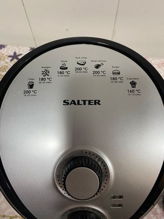 Freidora de aire Salter en color negro con un diseño moderno y elegante. Cuenta con dos mandos giratorios para ajustar la temperatura y el tiempo. - Color: Negro - Mandos: Temperatura y tiempo - Diseño: Moderno