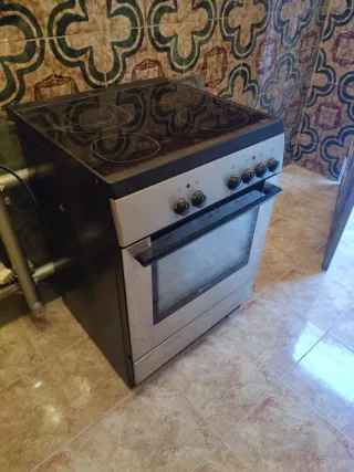 No se ha probado si funciona o no. Tiene todas las piezas. Aunque no se esta en la foto, tiene el cajón que hay debajo del horno. Las medidas son aproximadas. Marca Corbero, fabricado en España.
