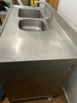 Fregadero industrial de acero inoxidable con dos senos. Ideal para cocinas profesionales o negocios. - Fabricado en acero inoxidable. - Doble seno para mayor funcionalidad. - Diseño robusto y duradero. Mide 150cm de largo x 72 ancho x 91 de alto Va con el grifo y con el pulsador de pie