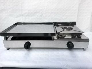 Combinación de plancha y fogón de gas. plancha hosteleria de asar a gas butano/nat para bar cocina med 800x400x210,se compone de plancha fija en cromoduro medidas 500x400 y un fuego a la derecha,4 quemadores canal recogegrasas trasero extraible,2 valvulas de seguridad con termopar homologada CE nueva a estrenar garantia 2 años disponibilidad inmediata.Fabricamos la plancha con más quemadores por superficie de cocción del mercado,es la plancha con mejor relación potencia/consumo Creperas food trucks Precio con IVA - Superficie de plancha. - Quemador de gas.
