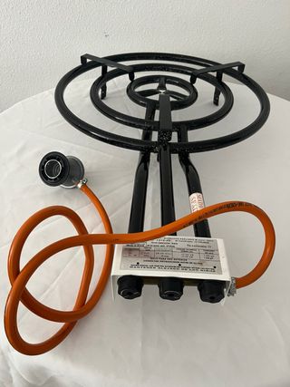 Hornillo o quemador de gas para paellas, con tres fuegos independientes. Ideal para exteriores. - Fabricado en España. - Conexión de gas. - Válido para uso exterior.