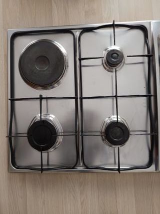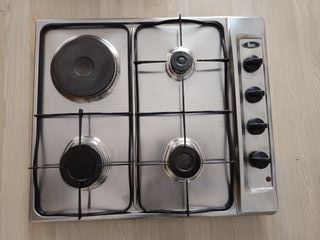 Vendo encimera de gas natural de acero inoxidable de la marca Teka. Cuenta con de cuatro fuegos (3 de gas y 1eléctrico) con dos rejillas de hierro fundido y mandos laterales para controlar la intensidad de la llama. Desinstalada funcionando, por cambiar a vitrocerámica, y en buen estado. Dimensiones: 60 cm de ancho x 50 cm de fondo. Teléfono de concontacto 625347109.