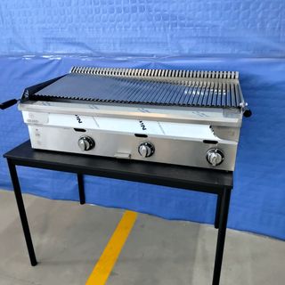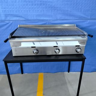 Barbacoa a gas de sobremesa con piedra volcánica que mide 70 cm de ancho. Es fabricada con un acero inoxidable muy resistente que la hace perfecta para bares y restaurantes. Tiene un sistema de rejilla para filtrar la grasa a la bandeja y tiene tres niveles de regulación de la intensidad del fuego. Las características técnicas son: - Medidas: 70x50x23 cm - Peso: 28 kg - Gas butano - Modificable a Gas Natural - Parrilla tipo S - Potencia: 23 kw Producto nuevo a estrenar. Barbacoa para Hostelería. Barbacoa a gas. Barbacoa con piedra volcánica.