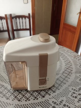 Máquina para hacer zumos de la marca Moulinex, modelo Vitafruit. Ideal para preparar tus bebidas de frutas favoritas. - Diseño compacto y funcional. - Color blanco y verde translúcido.