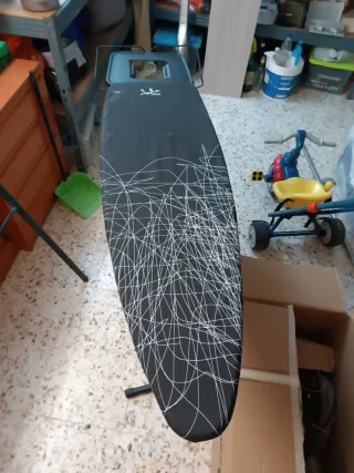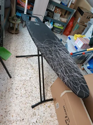 Tabla de planchar con un diseño moderno y elegante. - Cubierta negra con estampado de líneas blancas. - Estructura metálica resistente.