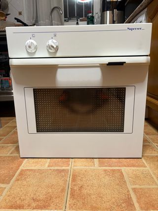 Horno de cocina marca Superser en color blanco. - Diseño frontal blanco. - Panel de control con dos mandos. - Puerta con ventana de cristal. - Acabado en blanco. - Medidas estándar