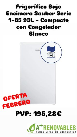 Frigorífico bajo encimera de la marca Sauber, modelo Serie 1-85. - Capacidad de 93 litros. - Compacto con congelador. - Color blanco. - Diseño en la UE. Frigorífico compacto blanco de 85 cm de alto, ideal para segundas residencias, estudios y oficinas. Capacidad de 93 litros y funcionamiento silencioso. #frigorificocompacto #neverapequeña #APlusRenovables #electrodomesticos #TuUltimoClic #oficina #apartamentos