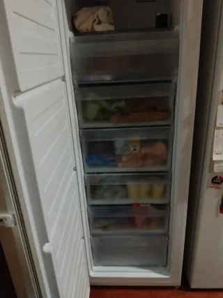 Congelador vertical de color blanco. 2 huecos más 5 cajones. - Puerta con bisagras. - Múltiples estantes interiores. Demasiado grande para mí .