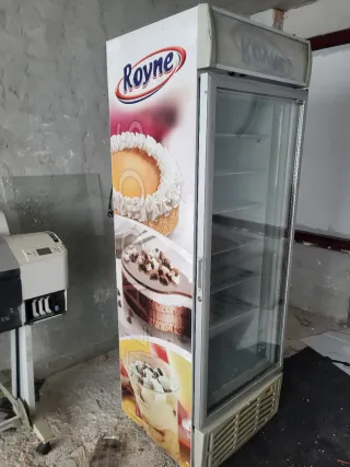 Nevera expositora vertical de la marca Royne, ideal para helados y postres. - Diseño con imágenes de tartas y helados. - Puerta de cristal. - Iluminación superior y interior