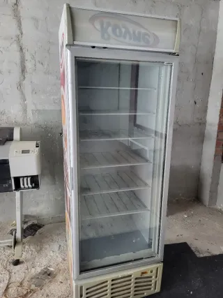 Vitrina expositora congelador con puerta de cristal. Solo ha servido para helados.funciona perfecto Medidas: Alto 1'99 Ancho 0'67 Fondo 0'62 - Estantes interiores. - Iluminación interior. - Diseño vertical.