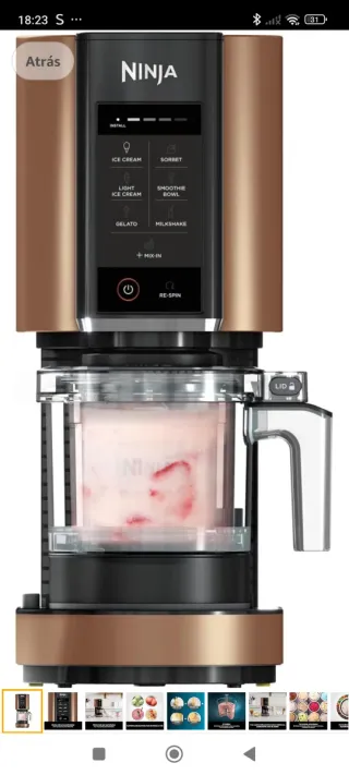 Máquina para hacer helados y postres congelados de la marca Ninja. Su diseño es moderno y elegante, con acabados en color cobre y negro. Ninja CREAMi Heladera multifunción, capacidad de 1,4L, 3 tarrinas, 7 programas, Helado, Gelato, Sorbete, Smoothie Bowl, Batido y más, negro/co - Panel de control digital con varias funciones. - Incluye bol para la preparación. - Permite hacer helado, sorbete, gelato, milkshakes y smoothie bowls. La heladera enciende y el botón de parpadea de encendido no para no se si es s para q le falta alguna accesorios por eso su precio