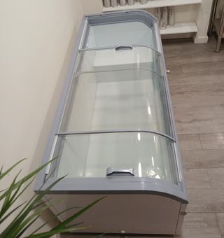 Congelador Arcon Johnson semi-industrial con tapa de cristal. - Medidas: 90 cm (alto) x 132 cm (ancho) x 65 cm (fondo). - Diseño blanco. - Ruedas para fácil movilidad.