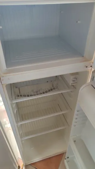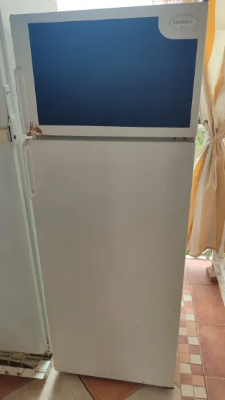 Frigorífico congelador de la marca Corberó en color blanco. Dispone de dos puertas y un diseño clásico. Tiene años y hace ruido, pero funciona a la perfección. Ideal para un chalet o segunda residencia - Color blanco. - Marca Corberó. - Dos puertas. - lo negro de la puerta superior es una pegatina de pizarra para poder escribir la lista de la compra.